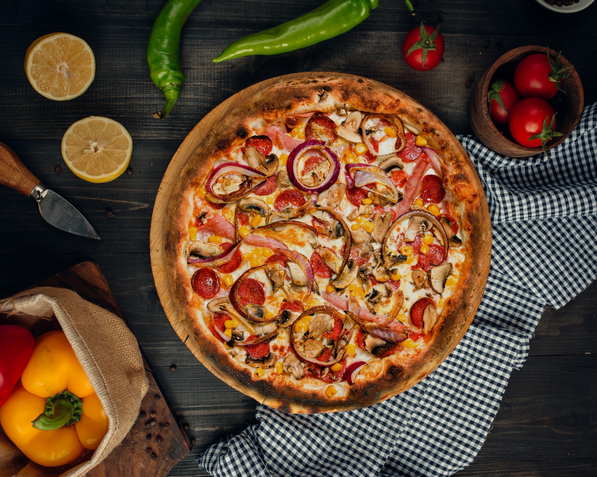 aluat, sos pizza, topping pizza, ciuperci, ceapă, ardei, porumb, măsline, roși -